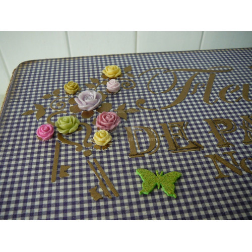 Detailne vypracovaná uzatvárateľná bednička v štýle SHABBY napr. na fotografie, CD, recepty, kozmetiku, šperky, čaj,  či iné poklady. Je zdobená technikou decoupage a scrapbooking - 3D efekt. Dozdobená je zlatým nápisom, čipkou, množstvom ružičiek z polyresinu a porcelánovou úchytkou s fialovými kockami. Je to veľmi pekný kúsok na praktické použitie, alebo na dekoráciu.