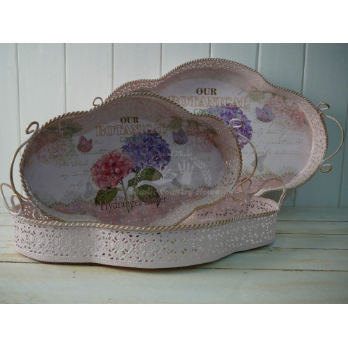 Sada 3 kusov kovových podnosov ružovej farby so zlatou patinou a obrázkom zn. INART. Uvedený je rozmer najväčšieho podnosu. Stredný podnos 43x26x9cm, najmenší podnos 39x23x9cm.