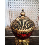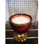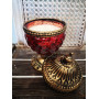 Červený sklenený svietnik s kovovým starozlatým uzatváraním v tvare kupoly v rustikálnom štýle. Svietnik je zvnútra plnený sviečkou, ktorá ešte viac zvýrazňuje jeho starodávne prepracovanie. Sklenený svietnik je na kovovom podstavci.