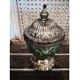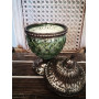 Zelený sklenený svietnik s kovovým starostrieborným uzatváraním v tvare kupoly v rustikálnom štýle. Svietnik je zvnútra plnený sviečkou, ktorá ešte viac zvýrazňuje jeho starodávne prepracovanie. Sklenený svietnik je na kovovom podstavci.